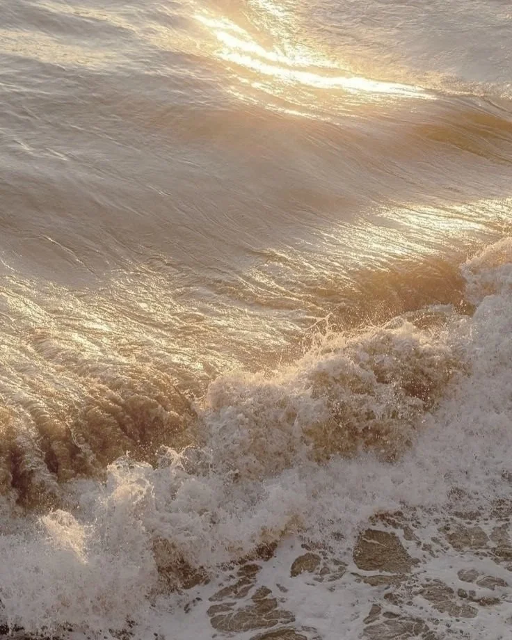 Golden sunlight reflecting off ocean waves near the shoreline.