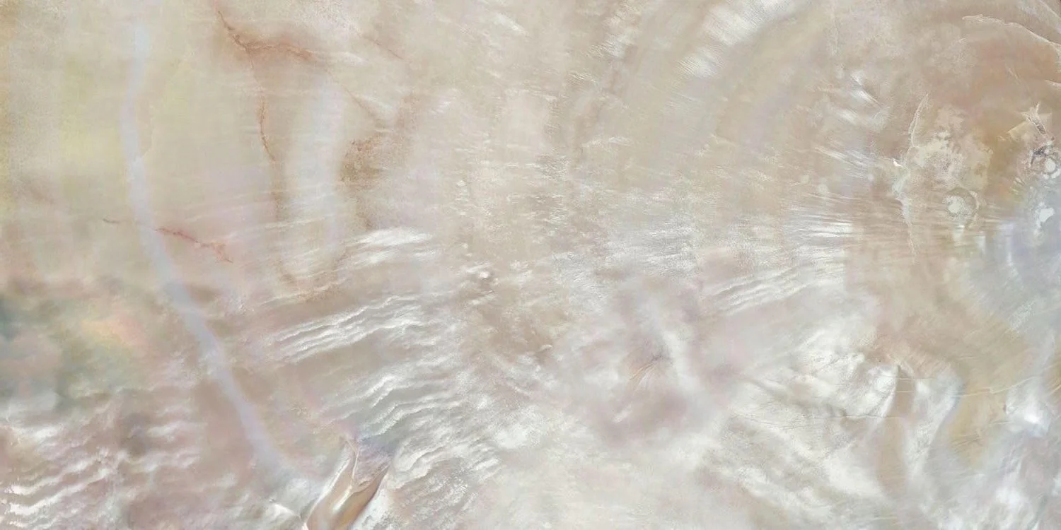 Close-up of a textured, shiny, pearl-colored surface with swirling patterns.